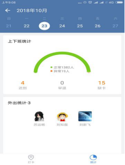 教师可通过手机查看每日考勤统计数据。如:正常1382人,异常19人。点击头像可查看异常详细。