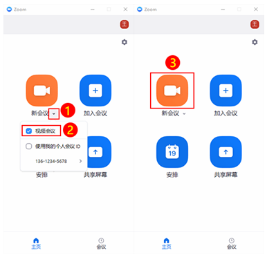 在账号注册完成后,打开zoom客户端,教师通过注册的账号登录客户端。1.点击“新会议”后的﹀箭头;2.勾选“视频会议”表示开启视频会议,不勾选“视频会议”表示开启音频会议;3.然后点击“新会议”图标,即可启动会议。