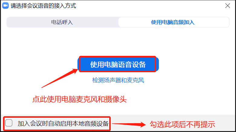 A:请在加入会议前确认会议语音的接入方式选择为“使用电脑语音设备”且未勾选“不自动连接语音”。如果已勾选,请在会议开始后需要发言时手动取消静音。