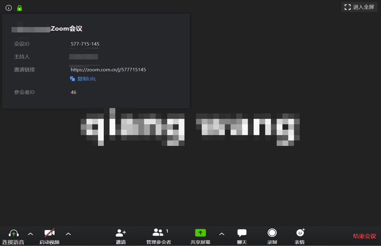 进入会议界面后,可以点击左上角感叹号,查看会议信息会议ID,邀请链接。