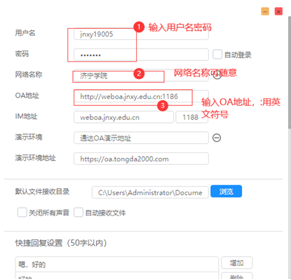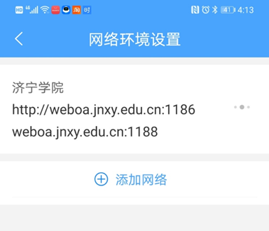 安装后,打开软件点设置按钮,添加网络,然后输入网络名称及OA地址:weboa.jnxy.edu.cn:1186 ,点确定按钮回到登录界面,切换网络名称后即可登录。
