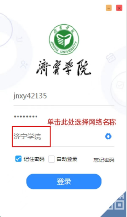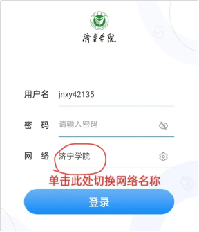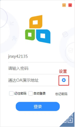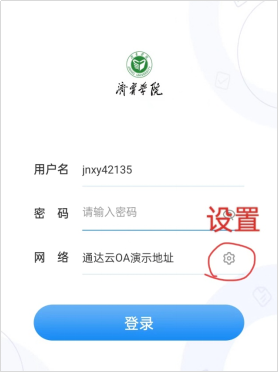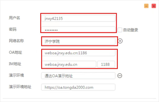 安装软件后,在登录界面点“设置”按钮,输入用户名密码、网络名称及OA地址:weboa.jnxy.edu.cn:1186 ,IM地址:weboa.jnxy.edu.cn:1188 ,然后点x回到登录页面,切换网络名称后即可登录。