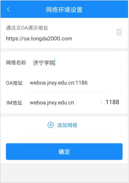 安装通达OA后,打开软件,点“设置”按钮-“添加网络”,然后输入网络名称及OA地址:weboa.jnxy.edu.cn:1186 ,IM地址:weboa.jnxy.edu.cn:1188 ,点确定按钮回到登录界面,切换网络名称后即可登录。