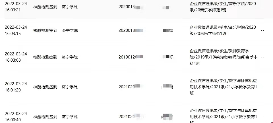 疫情期间,学校每日组织师生进行核酸抽检,网络安全与信息管理中心安排部署了网络技术保障,确保每个核酸检测采样点的设备稳定上网在线、各项工作有序进行。为了实现快速、准确的对师生核酸检测数据进行统计,网络安全与信息管理中心推出“核酸检测签到二维码”,师生在核酸检测时用微信或者企业微信扫描二维码,就完成了核酸签到登记工作,这样的签到不仅快速准确无接触,而且可以轻松筛查出漏做人员。