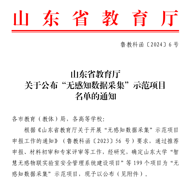 近日,山东省教育厅下发《关于公布“无感知数据采集”示范项目名单的通知》(鲁教科函〔2024〕6号),我校组织申报的“智慧监控中台项目”和“教、学、管、评一体化平台项目”成功获批全省“无感知数据采集”示范项目。