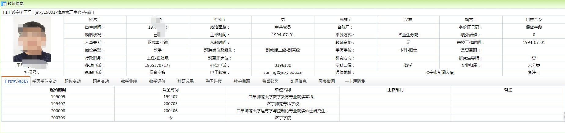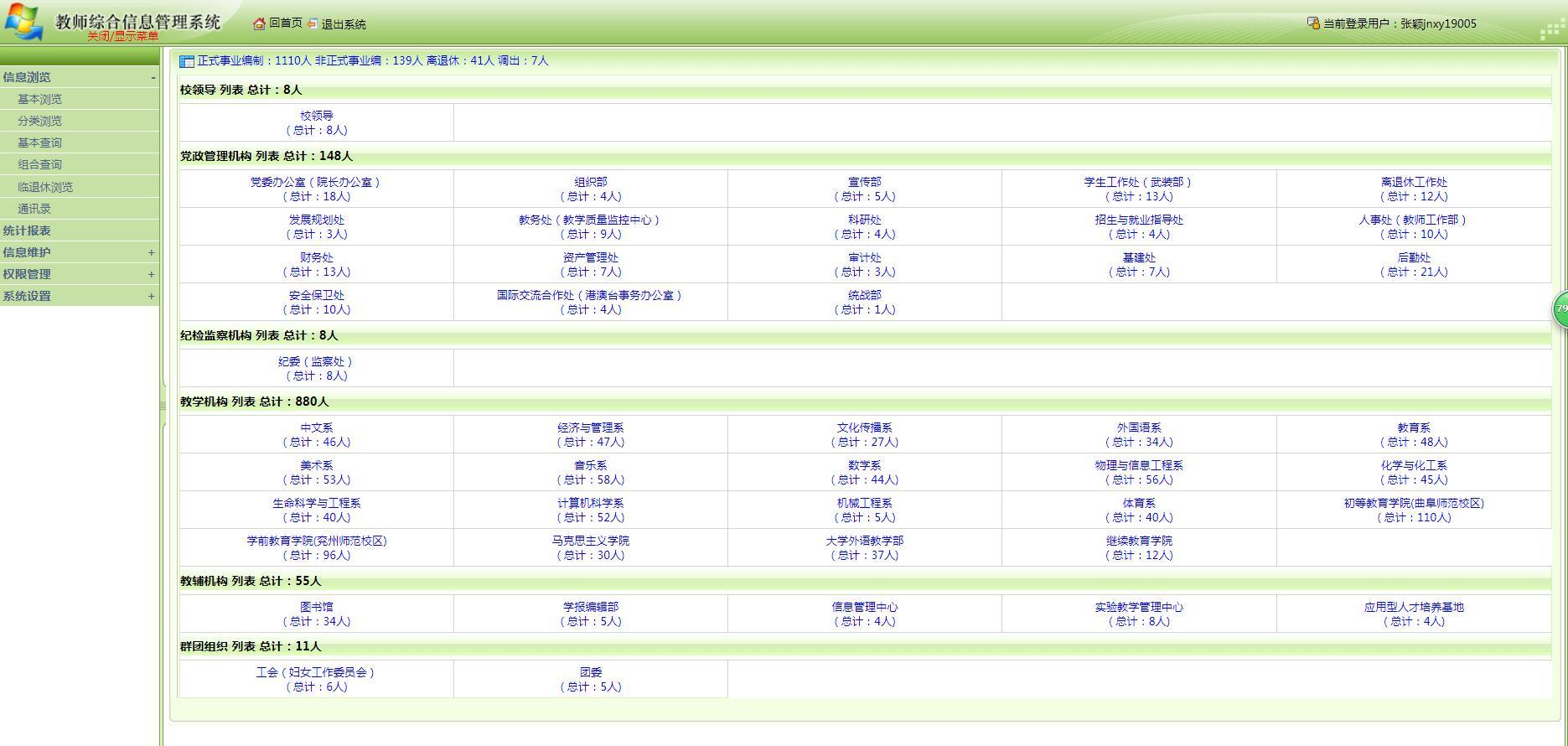 教师综合信息管理与决策系统采用了分级浏览、逐层深入、全局到个体的全新信息组织管理方式,区别于传统意义中的人事管理系统。教师综合信息管理与决策系统偏重于对信息的多角度展示与统计,采用了“全校—部门类别—部门—个体”的层次结构,既从宏观上统计了全校所有教职工数量、各部门人员数量和构成,也从细节上展示了教工所有相关信息,包括个人基本信息、工作学习简历、学历学位变动、职称变动、教学业绩、教学评价、科研成果、社会工作、职务变动、校内异动、学习进修、荣誉获奖、配偶等。另外,设计了多维度的统计分析报表,既提高了人事管理工作的质量和效率,为教师个人、人事管理者、部门领导和学校领导提供了及时动态的可靠数据,也为教师队伍的引进、人才培养、学科建设、专业建设和全校人力资源结构的合理规划、科学决策提供了决策依据。