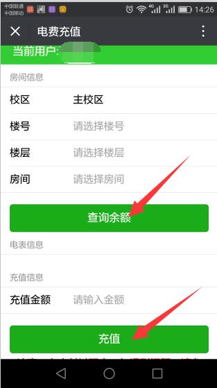 学生宿舍的电费充值,可以通过微信企业号的电费充值模块进行线上充值,只需选定选择楼号、楼层、房间号,进行查询余额或者充值。