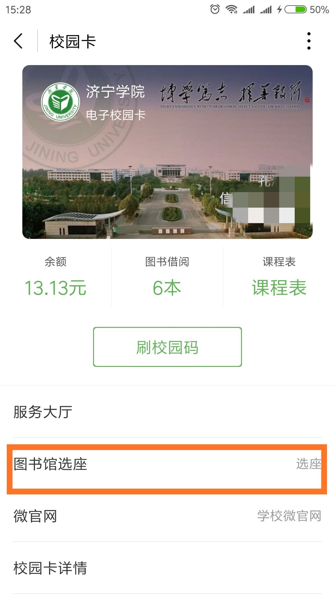 图书馆面向全体师生开通了阅览室微信选座功能,只需在济宁学院电子校园卡中找到图书馆选座并进入选座界面,可以设置常用的座位,也可以点击选择阅览室,再选择座位。选座后,学生只需在30分钟内到达选座地点就可。目前开通的智能选座的阅览室有c406和c402两个自修室。