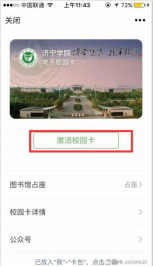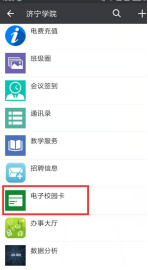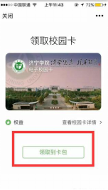 2、成功关注济宁学院企业号之后,在企业号中找到电子校园卡应用,进入应用点击领取校园卡->领取到卡包,并激活校园卡,完成领卡。
